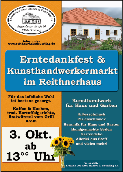 Am Freitag den 03. Oktoberfindet ab 13:00 Uhr das traditionelle Erntedankfest mit Kunsthandwerkermarkt im Reithnerhauses statt.
