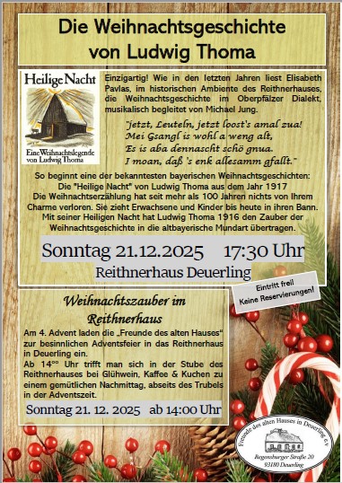 Alle anderen Veranstaltungen wie z.B. Ausstellungen, Sitzweil. Lesungen etc. werden weiterhin von den "Freunden des alten Hauses in Deuerling e.V."mit seinen ehrenamtlichen Helfern veranstaltet.
