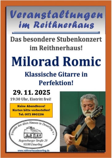 Am Samstag den 29. November findet um 19:30 Uhr ein Stubenkonzert mit dem vielfach ausgezeichneten Gitarristen Milorad Romic statt.
